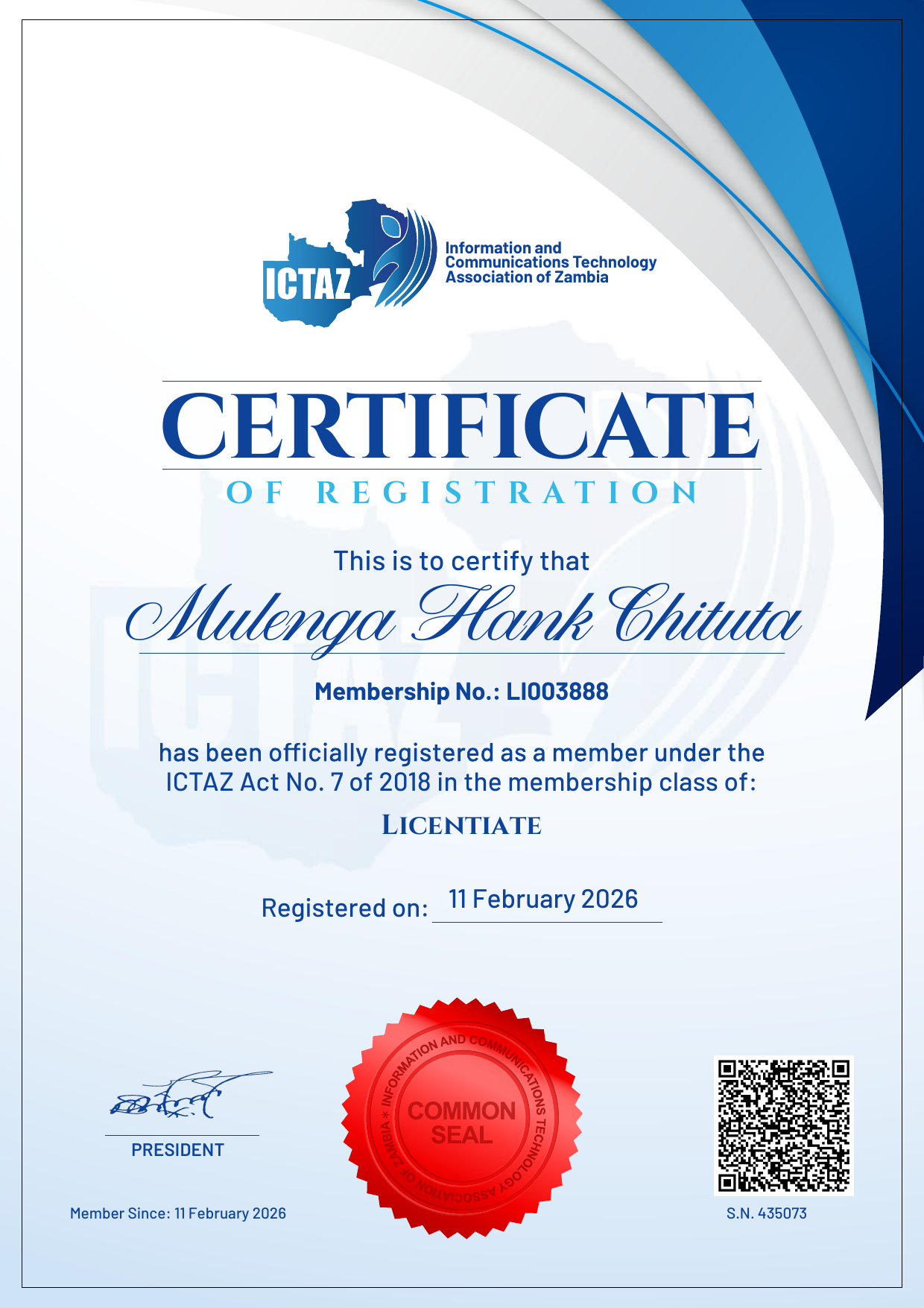 This section highlights my academic background, professional certifications, and industry memberships. It includes my full Curriculum Vitae, my membership and practicing license with ICTAZ, as well as additional certifications in Linux, Python, Networking, Cybersecurity, and related fields.